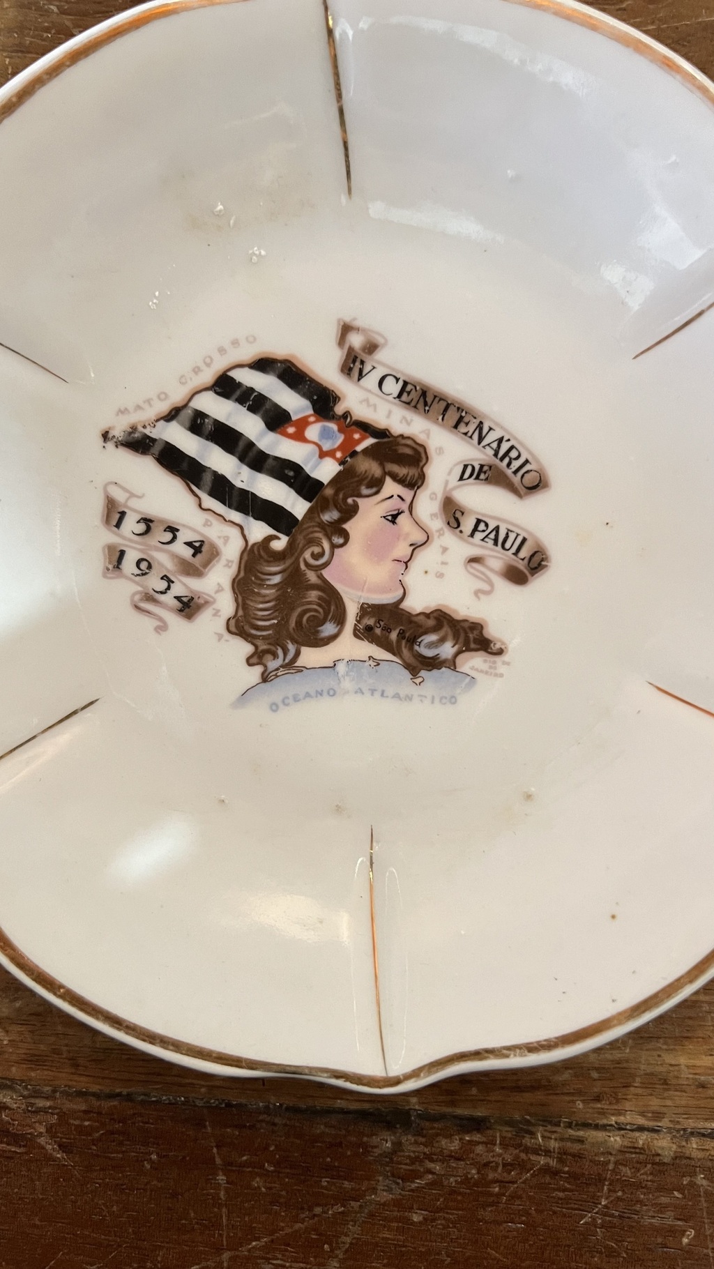 Prato em porcelana comemorativo alusivo ao IV Centenário de São Paulo (1554 - 1954) mostra o mapa do Estado utilizando uma das imagens da Revolução Constitucionalista de 1932, período que ficou conhecido como Estado Novo (1930-1945), marcado pela tentativa de secessão do Estado de São Paulo.